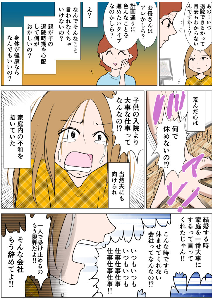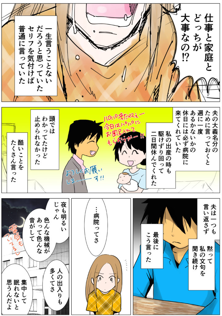 旦那だって仕事がない日は病院で可能な限り面会をしてくれていたのに、自分一人だけが頑張っているような気になっていたのですね。